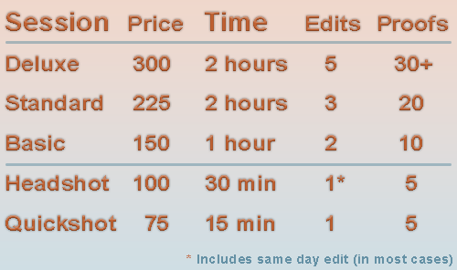 Every portrait session is unique and several options are offered to meet your needs. A basic portrait session starts at $150 with shorter headshot and "quickshot" sessions available starting at $75. Events and Products are scheduled and priced in accordance to each situation. For more details, please contact mark@markgunterphoto.com with information on your specific situation.